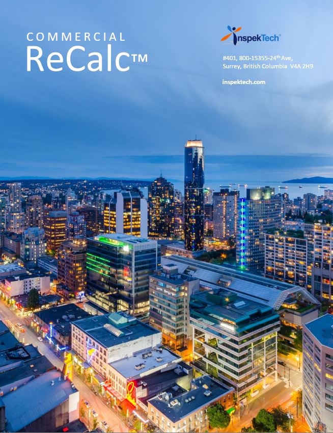 (1) InspekTech® Commercial Standard report: A certified Replacement Value appraisal report that includes a site visit. This service does not include automatic annual updates via our ReCalc™ (though ReCalc™ updates may be ordered separately in proceeding years).